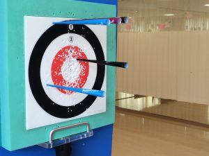 スポーツ吹き矢は1998年に日本で生まれた新しいスポーツで、円形の的をめがけて息を使って矢を放ちます。