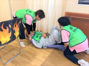 中々車椅子に乗らない利用者(認知症役)を避難させています