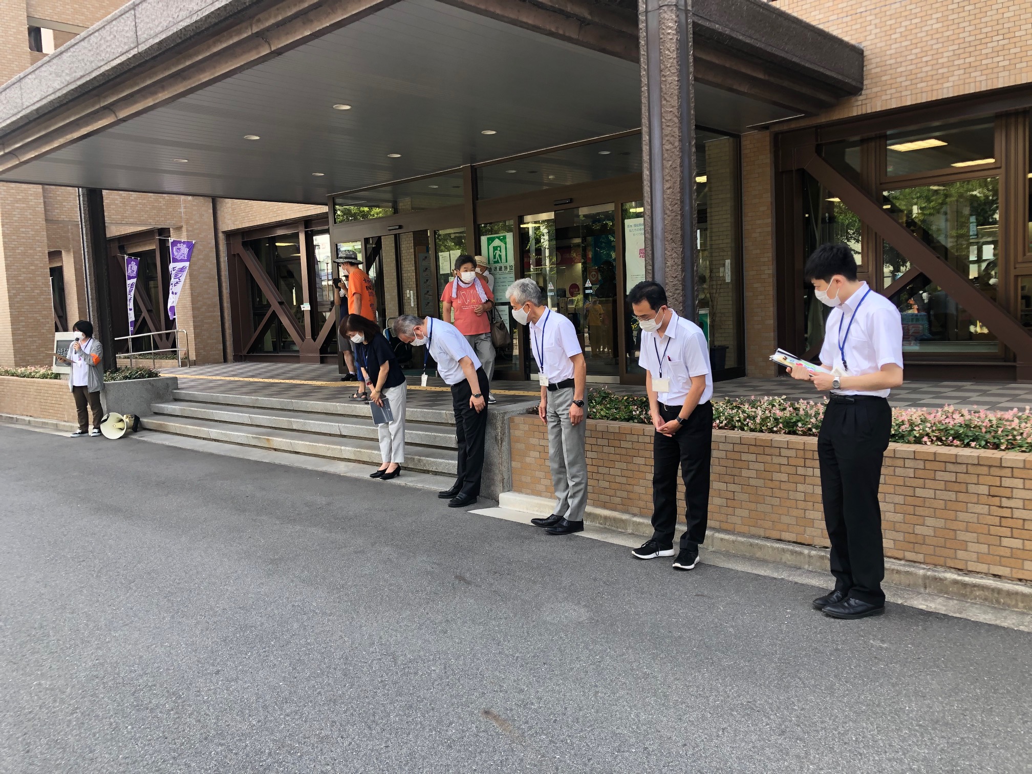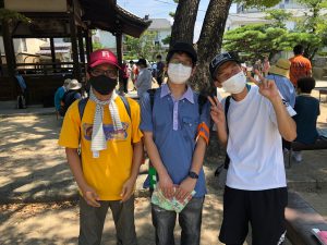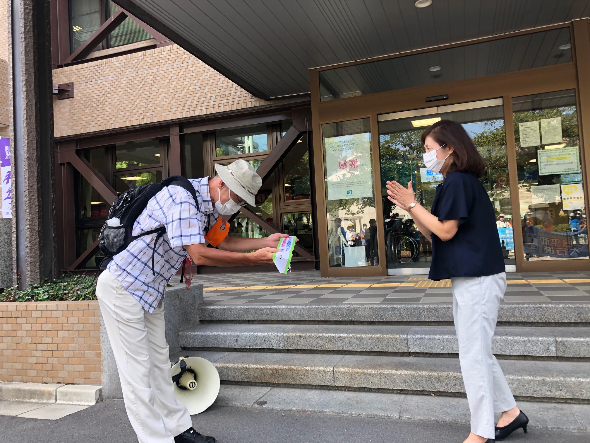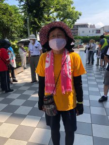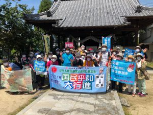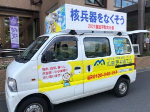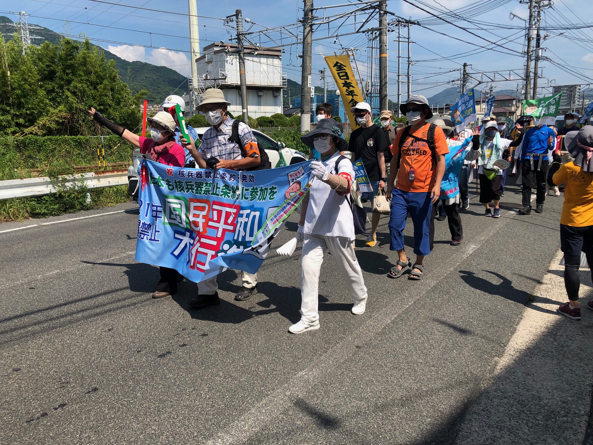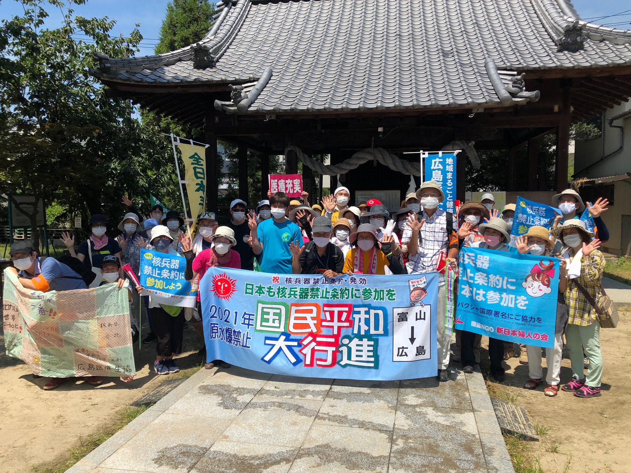 広島コース。は8月2日が安佐北区、3日が安佐南区、4日は中区平和公園噴水前の終結地点まで手分けしてリレーで歩きました。安佐南では約50名が参加。区長さんのあいさつの後、新庄橋まで。途中の祇園・熊野神社では、医療生協の組合員さん方が恒例のおもてなし…地域の神社総代さんたちが駐車スペースや休憩所など配慮して下さりひと息。「日本政府は核兵器禁止条約に加われ~!」の宣伝カーのアナウンスにコロナ対策で声を出さずにハリセンをたたいてアピールしながら、核廃絶の思いを込めて歩き通しました。(^^)/