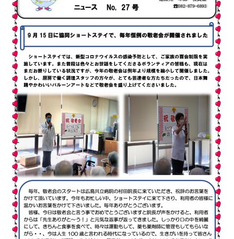 新型コロナウィルス対策本部ニュース No,27号 2020年9月25日発行 今回は協同ショートステイで行われた敬老会開催について紹介します。 >続きはこちら