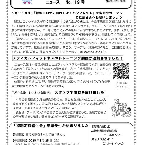新型コロナウィルス対策本部 ニュース No,19号 2020年5月29日発行 「新型コロナに負けんよ!パンフレット」作成のほか、トレーニング動画、子ど >続きはこちら