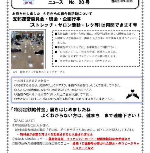新型コロナウィルス対策本部 ニュース No,20号 2020年6月2日発行 6月からの組合員活動に関する内容を掲載しています。特別定額給付金に関するお >続きはこちら