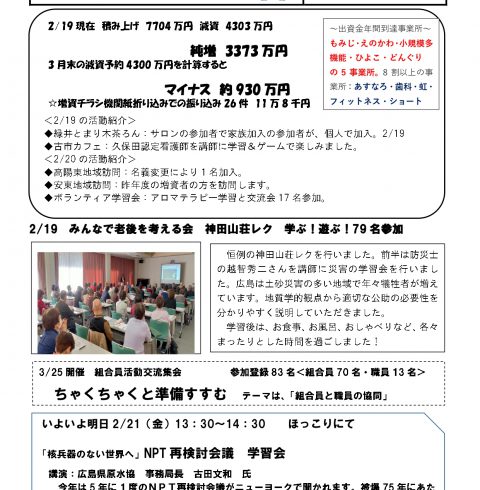 2/19「みんなで老後を考える会」では、恒例の神田山荘レクを行いました。前半は防災士の越智秀二さんを講師に災害の学習会を行いました。 広島は土砂災害の >続きはこちら