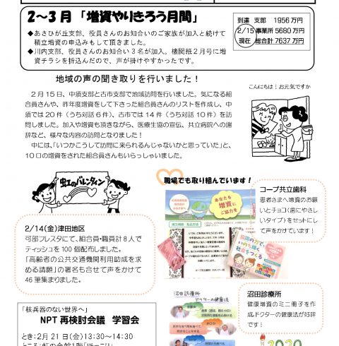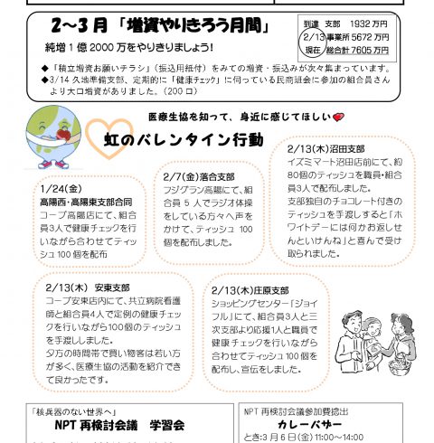 2月~は増資やりきろう月間。 地域訪問を実施し加入と増資がありました。 バレンタイン行動の報告も!